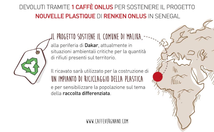 Il progetto sostenuto da Caffè Vergnano permetterà, inoltre, Renken Onlus (un’associazione di cooperazione internazionale senza fine di lucro nata nell’ottobre del 2006 a Torino in seguito ad un viaggio in Senegal intrapreso da alcuni soci fondatori), di incentivare attività di raccolta dei rifiuti porta a porta, differenziazione, riciclo e riuso grazie ad una campagna di sensibilizzazione della popolazione.
