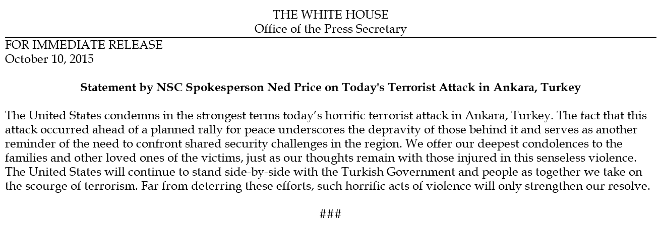 Il Presidente Mattarella ha inviato al Presidente della Turchia Erdogan, il seguente messaggio: “Ho appreso con grande amarezza dell’ignobile attentato perpetrato stamani ad Ankara contro civili innocenti che manifestavano per la pace. Desidero condannare nella maniera più risoluta tale gesto vile e riprovevole che, nella sua barbara efferatezza, richiama l’urgenza di combattere uniti la piaga del terrorismo. In questo momento di grande dolore, desidero esprimere, Signor Presidente, la sincera vicinanza degli italiani tutti e dell’Italia, Paese amico ed Alleato, a Lei, alle famiglie delle vittime e all’amico popolo turco”.